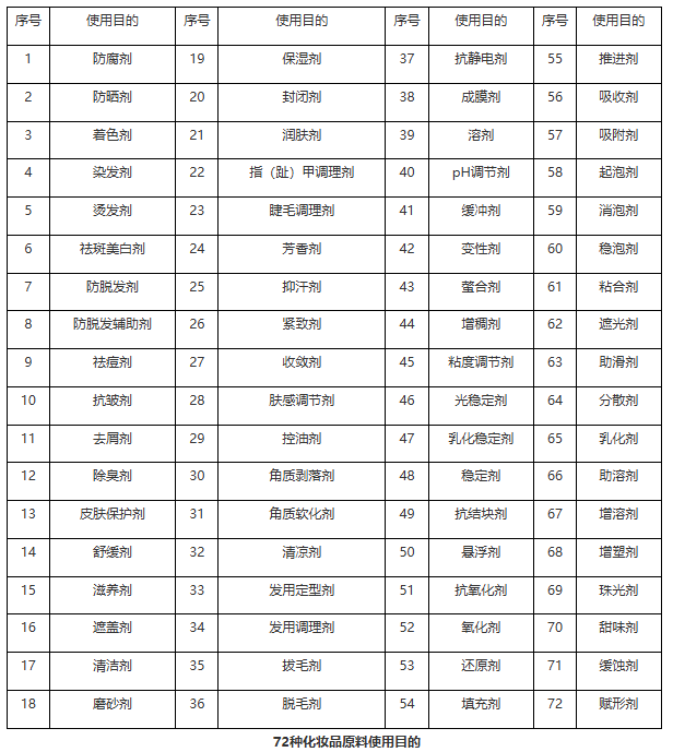 答:《化妝品原料使用目的技術(shù)指南(試行)》附表為《化妝品原料使用目的目錄》(以下簡稱《目錄》),包括72種原料使用目的及說明?!赌夸洝肥窃诔浞謪⒖紘庀嚓P(guān)標準的基礎(chǔ)上,依據(jù)我國現(xiàn)行法規(guī)標準以及行業(yè)使用情況等進行制定。使用目的具體如下: