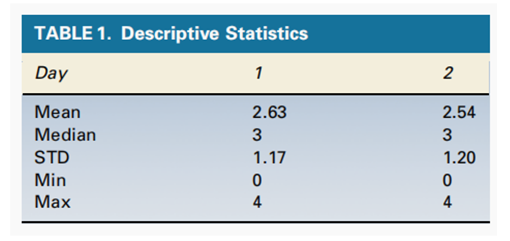 對每日評分進行描述性統(tǒng)計(標準差、平均值、中位數、最大值和最小值)計算(見表1)。評級的穩(wěn)定性以雙變量散點圖(氣泡圖)的形式進行可視化。氣泡圖是一種在散點圖上表示變量間關系的方法。兩個變量的觀測值以常規(guī)方式繪制,使用圓圈作為符號;圓圈的半徑與第三個變量的關聯(lián)值成比例。給定分數的頻率決定了氣泡的大小,這些氣泡理想地位于對角線上。