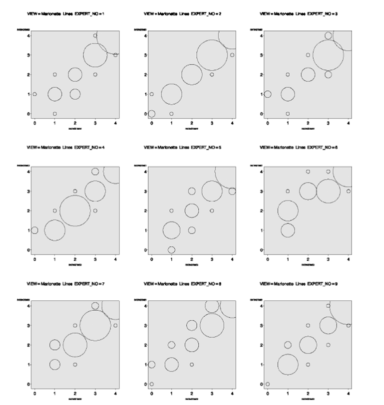 專家們達成高度一致性,氣泡圖(雙變量散點圖,bivariate scatter plots)顯示了專家判斷的線性關系。