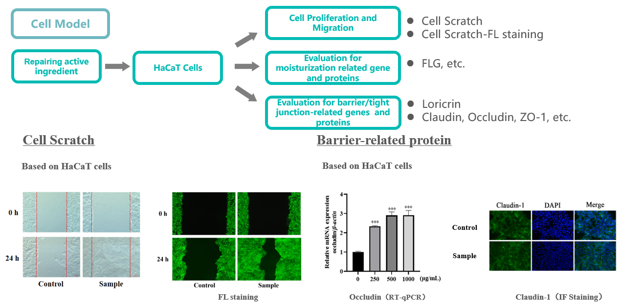 Repairing | Barrier-related genes in HaCaT cells | Expression of barrier-related genes (AQP3, FLG, Caspase-14 , Claudin-1, occludin) |