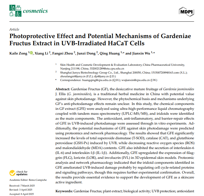 近日,杭州瑞旭科新生物技術(shù)有限公司(以下簡(jiǎn)稱“科新生物”,CIRS Biotech)與上海君裕生物科技集團(tuán)有限公司(以下簡(jiǎn)稱“君裕集團(tuán)”)聯(lián)合開展的梔子提取物(Gardeniae Fructus Extract)抗皮膚光損傷研究取得突破性進(jìn)展。該項(xiàng)研究成果已發(fā)表于國(guó)際知名期刊《Cosmetics》(SCI收錄),為抗光損傷類化妝品功效原料的研發(fā)與評(píng)價(jià)體系構(gòu)建提供了重要科學(xué)依據(jù)。