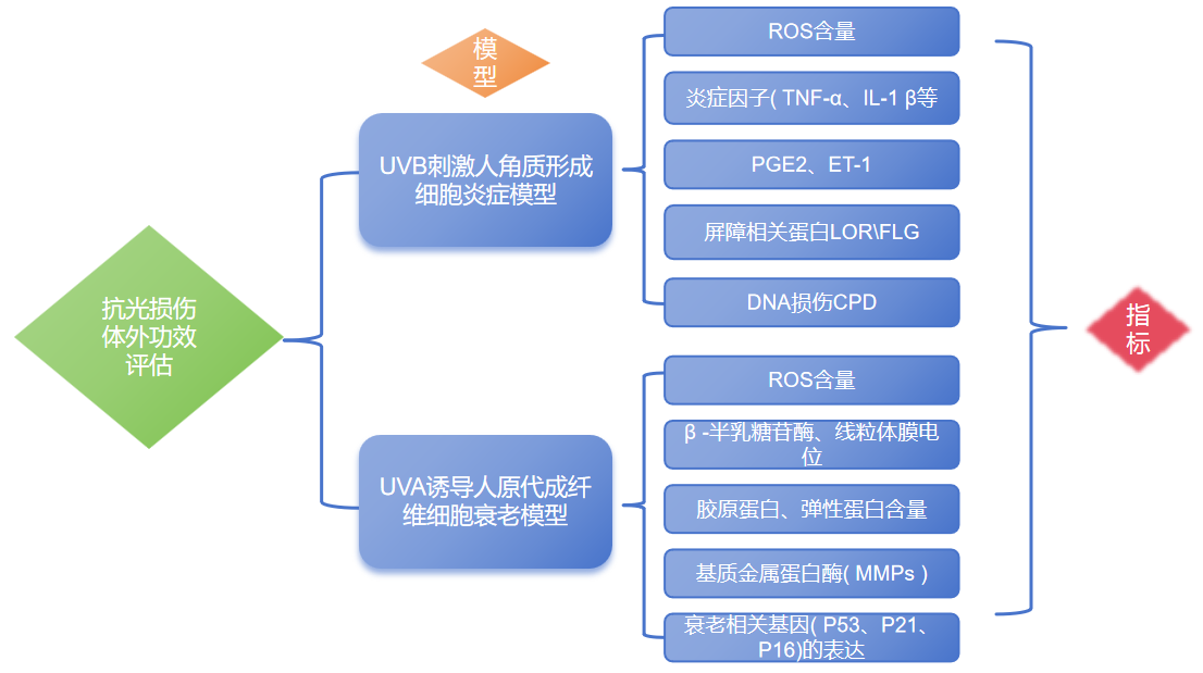 在深入探究光損傷的引發(fā)機制及影響后,我們構(gòu)建出一個依據(jù)角質(zhì)形成細胞的抗光損傷體外功效評估體系,用以評估化妝品原料及成品的抗光損傷效能。