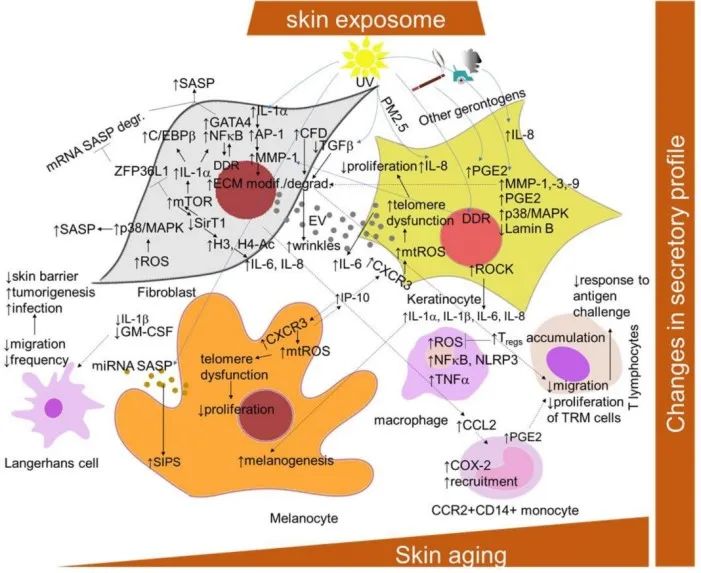 炎癥表現(xiàn)為血清炎癥細(xì)胞因子(如IL-6,IL-8和TNF-α)水平升高,不僅僅限于與年齡相關(guān)的全身性改變,還可能涉及皮膚老化。值得注意的是,衰老過程中積聚在皮膚中的衰老細(xì)胞在驅(qū)動(dòng)皮膚發(fā)炎方面起主要作用[5]。它們表現(xiàn)出改變的分泌組,稱為衰老相關(guān)分泌表型(SASP),其包括促炎細(xì)胞因子,趨化因子,蛋白酶和生長因子,可顯著改變皮膚的微環(huán)境[6]。