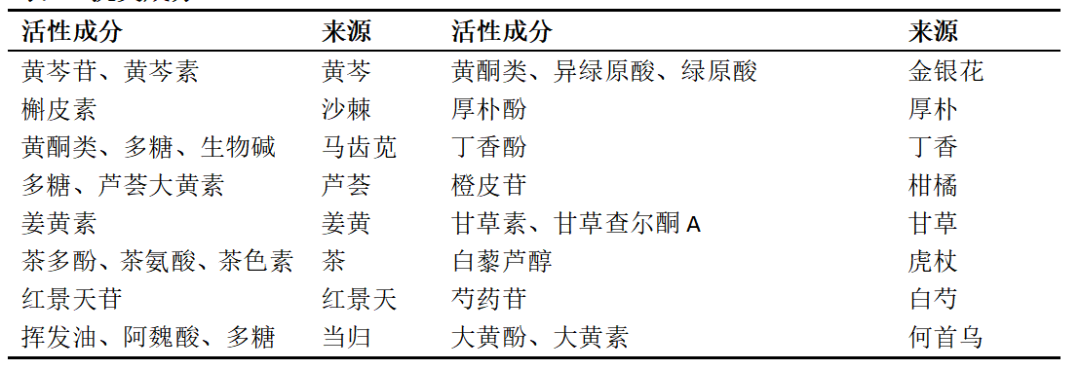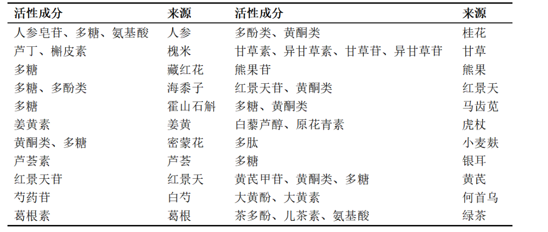 與傳統(tǒng)化妝品相比較,中藥來源的抗衰老成分是從植物中提取出來的天然物質(zhì),分子更細(xì)小,更容易被皮膚吸收和消化,而且不致在體內(nèi)產(chǎn)生沉積,目前市場(chǎng)上已有多種來源于中藥活性成分被用于化妝品的生產(chǎn)(見下表)[9-10]。