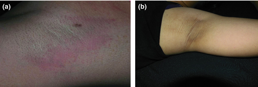 圖2 (a)剃毛引起的腋下紅斑(注意照片下半部分凹陷處的紅色皮膚區(qū)域)